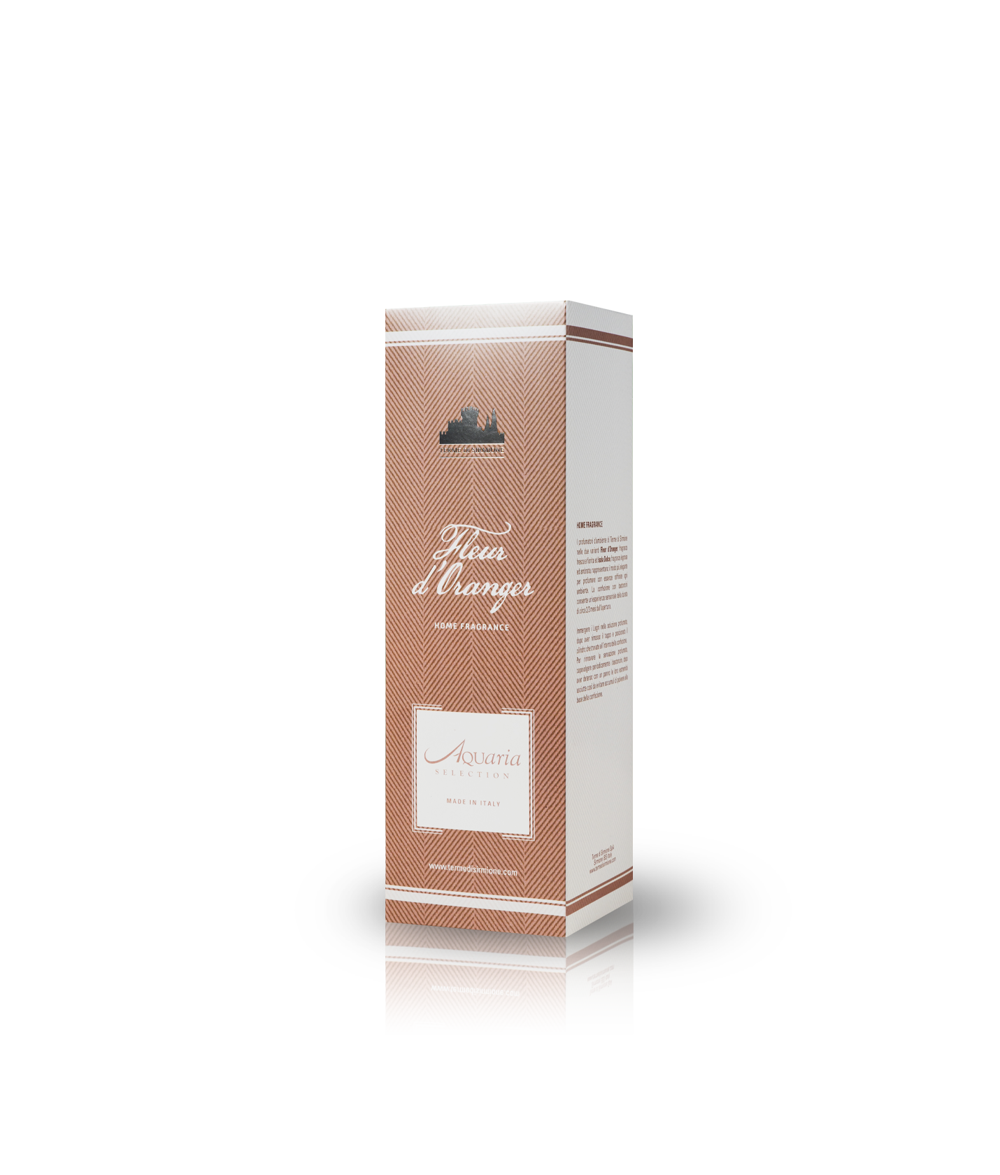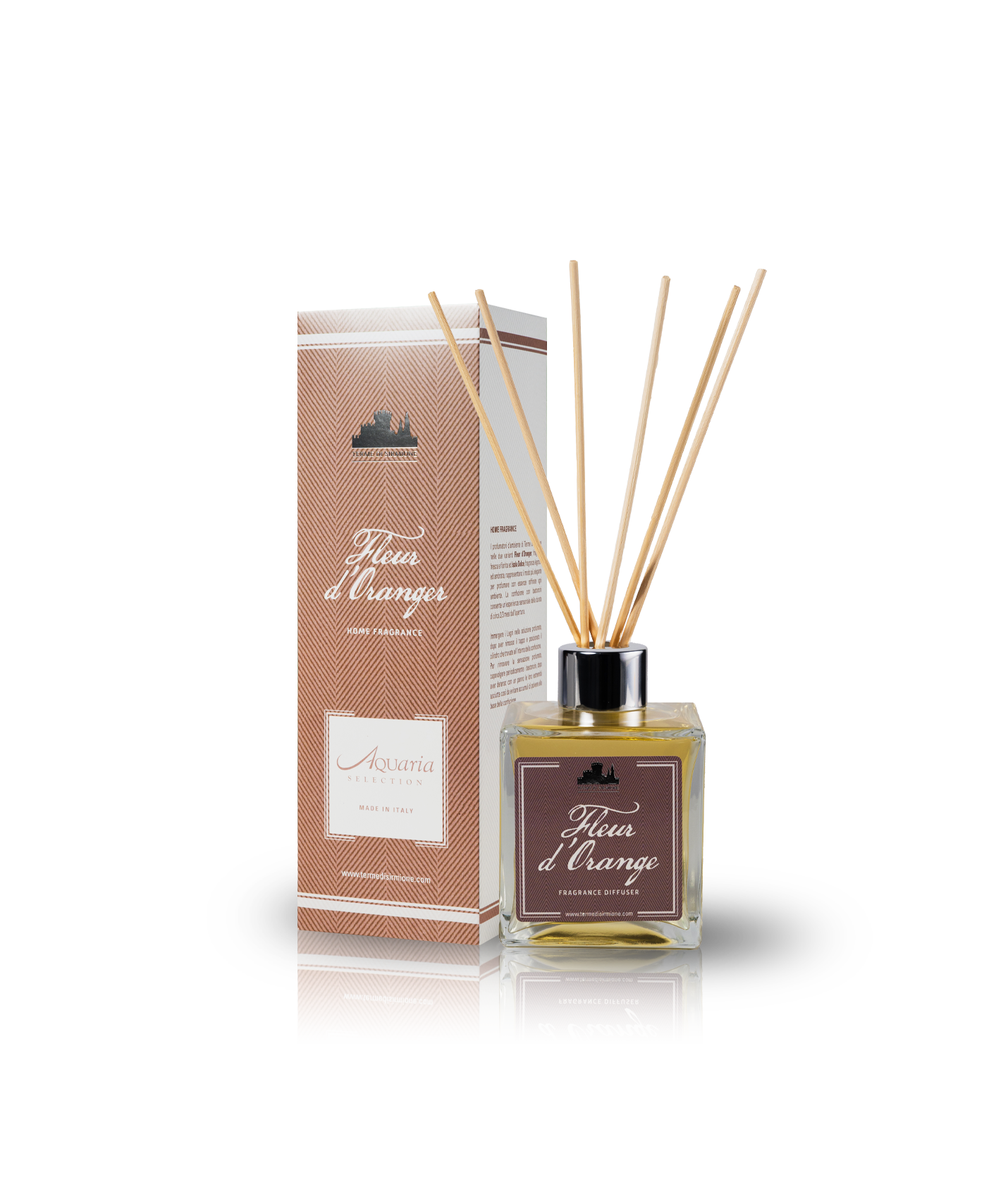 A Terme di Sirmione Home Fragrance set with aroma reeds, featuring this orange blossom fragrance: the most elegant and classy way to perfume every room in the house. The clear glass vase, with its contemporary design, featuring a silver ring and a bouquet of wooden reeds, also makes this luxury product the ideal gift idea.